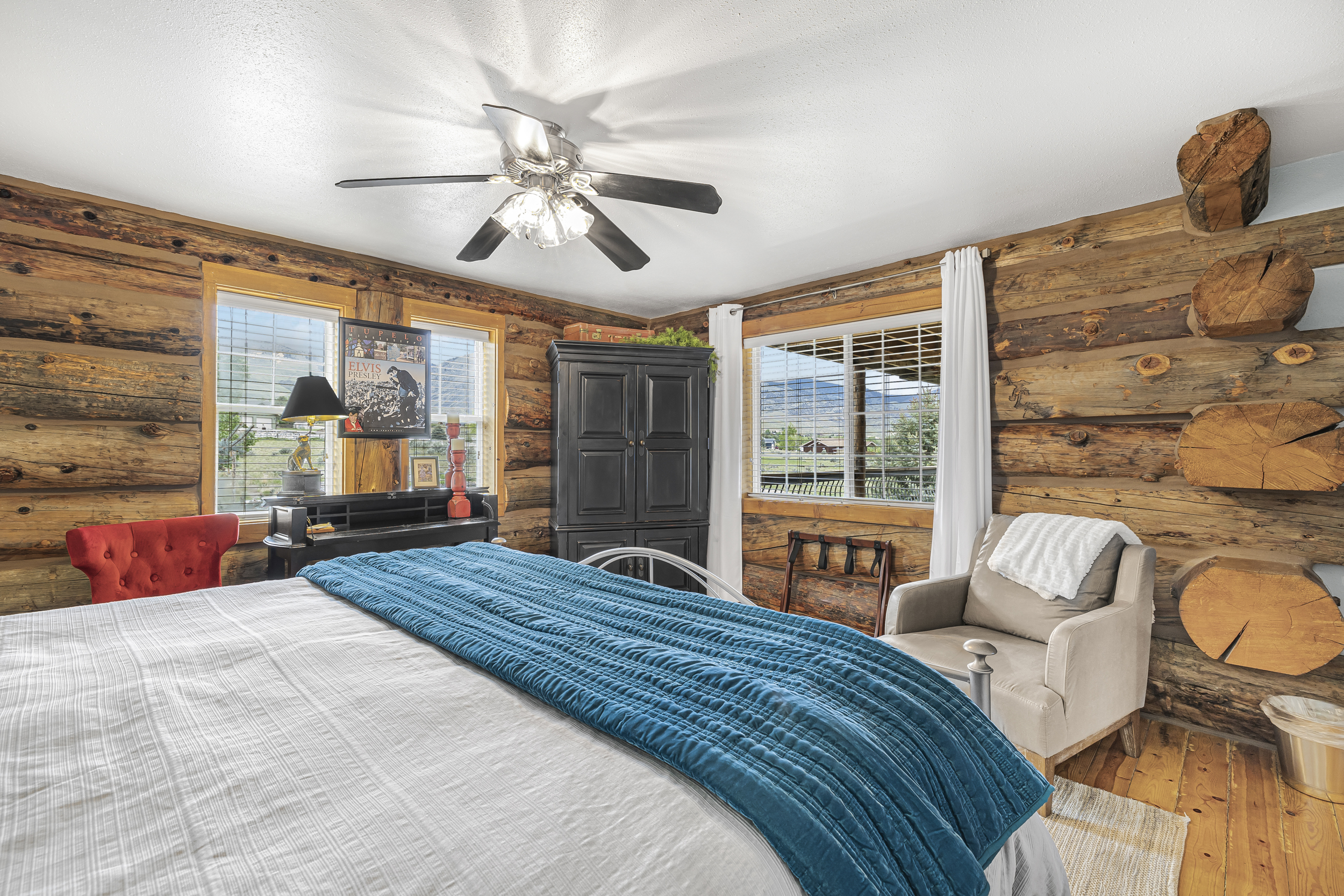 The Lupine is a most enchanting room, located on the west side of the second floor of the lodge. This room brings with it décor from the hometown of the owners, Tupelo, Mississippi. The elaborate king sized bed, the yellow and white slipper chair, the black desk, and the picture of Elvis Presley on the wall add the crowning touch this room needs to give you a rock ‘n’ roll stay.